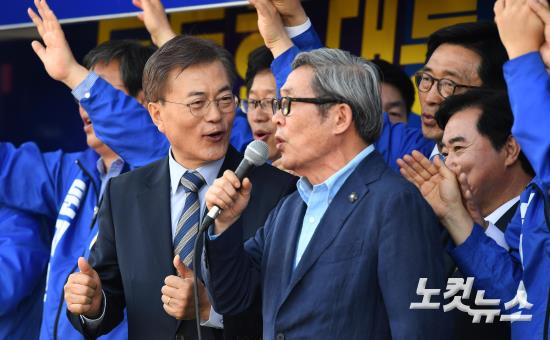더불어민주당 문재인 대선 후보가 28일 오후 전북 익산역 광장에서 집중 유세를 마친 뒤 임종수 작곡가와 '고향역'을 부르고 있다. 임 작곡가는 나훈아의 '고향역'을 작사, 작곡했다.