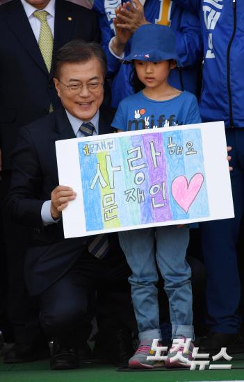 더불어민주당 문재인 대선 후보가 28일 오후 전북 익산역 광장에서 집중 유세를 하기 전 한 어린이에게 그림 선물을 받고 있다.