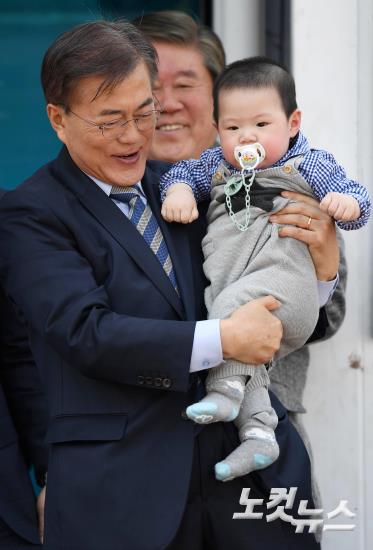 더불어민주당 문재인 대선 후보가 28일 오후 전북 익산역 광장에서 집중 유세를 하기 전 한 어린이를 안아주고 있다.