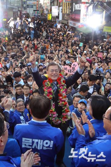 더불어민주당 문재인 대선 후보가 28일 오후 광주 충장로에서 열린 집중 유세에서 지지자들의 환호에 화답하고 있다.