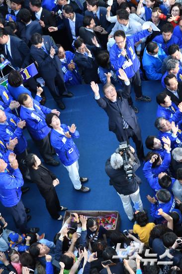 더불어민주당 문재인 대선 후보가 28일 오후 광주 충장로에서 열린 집중 유세에서 지지자들에게 인사하고 있다.