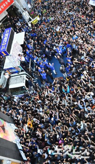 더불어민주당 문재인 대선 후보가 28일 오후 광주 충장로에서 열린 집중 유세에서 지지자들에게 인사하고 있다.