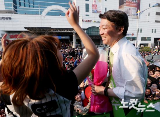 국민의당 안철수 대선후보가 30일 오후 경기 부천역 앞에서 가진 유세에서 학생들에게 꽃다발을 받고 있다.