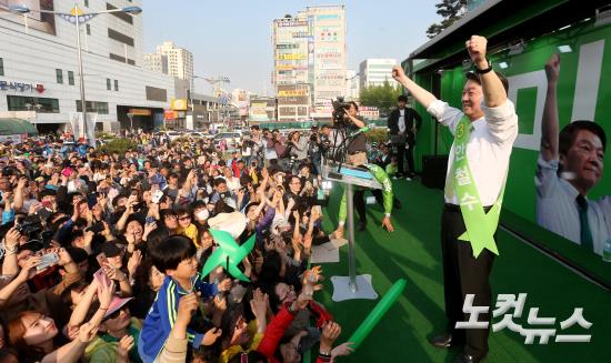 국민의당 안철수 대선후보가 30일 오후 경기 부천역 광장에서 열린 집중유세현장에서 단상에 올라 지지호소를 하고 있다.
