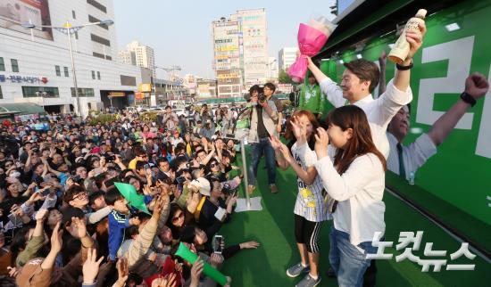국민의당 안철수 대선후보가 30일 오후 경기도 부천시 부천역 앞에서 가진 유세에서 학생들에게 꽃다발을 받고 두팔을 들어올리고 있다.
