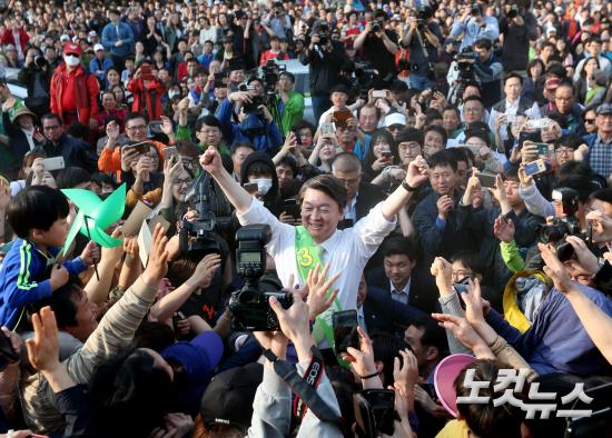 국민의당 안철수 대선후보가 30일 오후 경기 부천역 광장에서 열린 집중유세현장에서 단상에 올라 지지호소를 하고 있다.