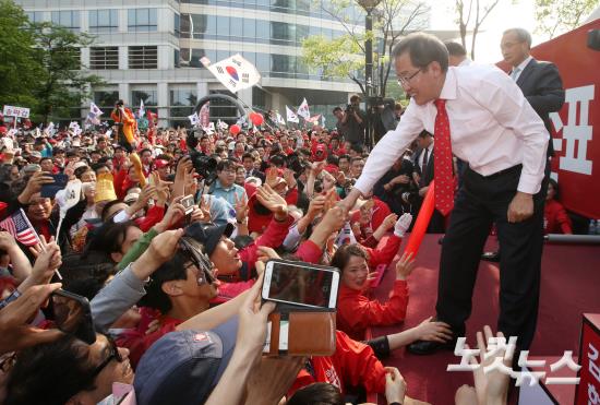 자유한국당 홍준표 후보가 30일 오후 서울 강남구 삼성동 코엑스 앞에서 지지자들과 인사를 하고 있다.