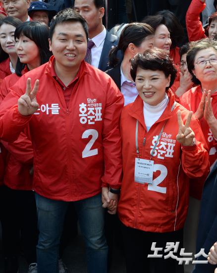 30일 오후 서울 강남구 삼성동 코엑스 앞에서 열린 홍준표 자유한국당 대선후보의 '자유대한민국 수호를 위한 서울대첩' 유세에서 홍 후보의 큰아들 정석씨(왼쪽)와 부인 이순선씨가 지지를 호소하고 있다.