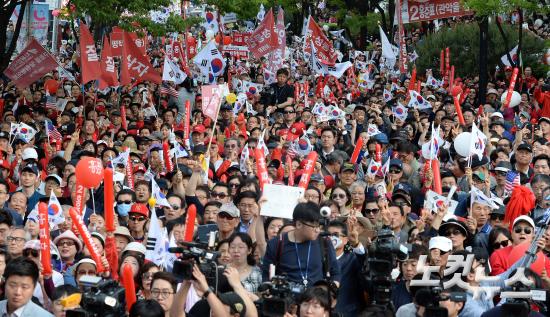 30일 오후 서울 강남구 삼성동 코엑스 앞에서 열린 홍준표 자유한국당 대선후보의 '자유대한민국 수호를 위한 서울대첩' 유세를 찾은 시민들이 홍 후보의 연설을 들으며 환호하고 있다.