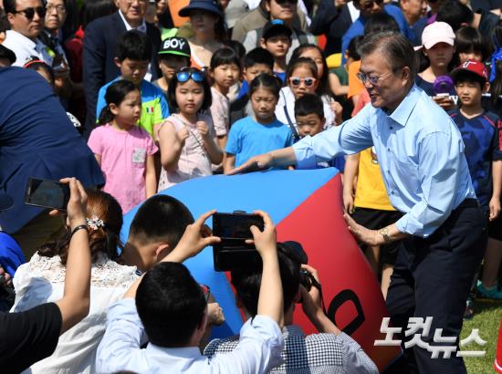 더불어민주당 문재인 대선후보가 5일 오전 국회 앞마당에서 열린 어린이날 행사에 참석해 어린이들과 큰공 굴리기를 하고 있다.