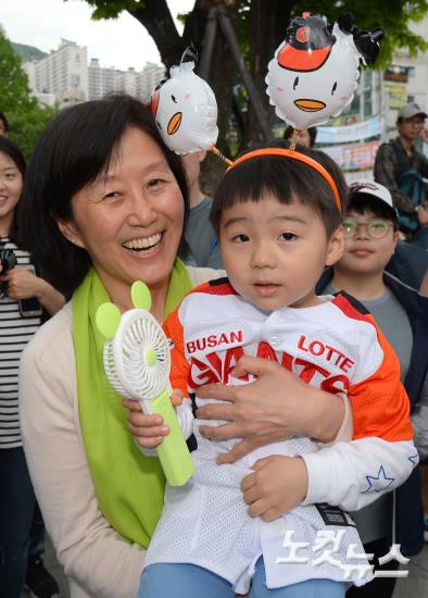 5일 오후 부산 동래구 사직야구장 앞에서 안철수 국민의당 대선 후보의 부인 김미경 교수가 한 어린이를 안고 기념촬영을 하고 있다.