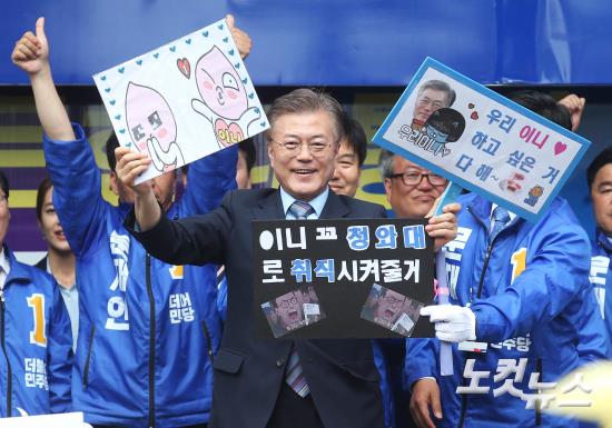 더불어민주당 문재인 대선 후보가 5일 오후 경북 포항시 중앙상가길에서 열린 집중유세에서 지지자들로부터 받은 피켓을 들어보이고 있다.