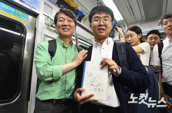 국민의당 안철수 대선 후보가 5일 오후 부산 동래구 사직구장에서 '걸어서 국민 속으로' 도보유세를 마친 후 행선지인 자갈치시장 방문을 위해 탑승한 지하철에서 안 후보의 저서인 '안철수의 생각'을 들고 탑승한 학생과 사진을 찍고 있다.