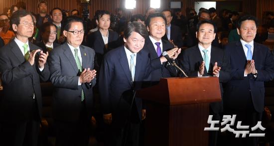 국민의당 안철수 후보가 19대 대선 투표일인 9일 오후 서울 여의도 국회의사당 헌정기념관에 마련된 국민의당 선대위 개표상황실에 입장을 밝히고 인사를 하고 있다.