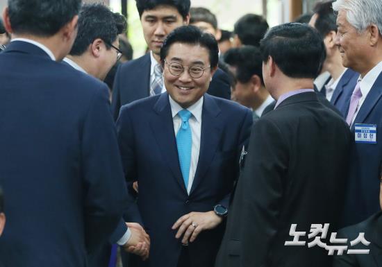 전병헌 청와대 정무수석이 15일 서울 여의도 더불어민주당 당사에서 열린 중앙위원회의에서 참석자들과 인사를 나누고 있다.