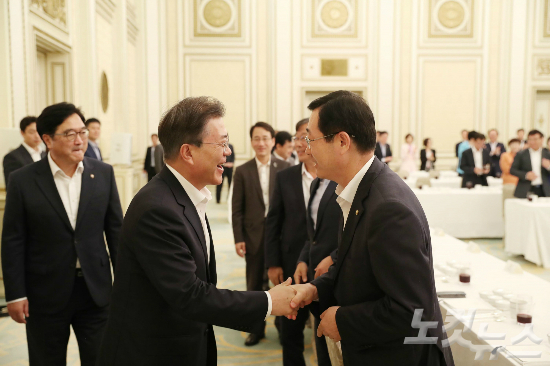 문 대통령은 헤드테이블로 이동하면서 많은 의원들과 악수를 하며 반갑게 맞았다.