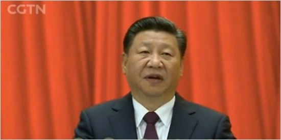 25일 중국 공산당대회 폐막식에서 시진핑 사상이 들어간 공산당 당장(당헌) 수정안에 찬성하며 오른손을 들고있는 사진이 실려있는데, 시진핑 좌우에는 후진타오, 장쩌민 전 주석이 함께 앉아있다.