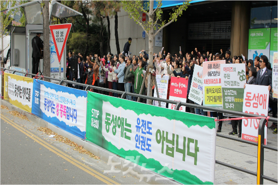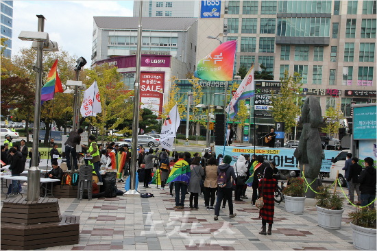 퀴어 문화제가 있은 롯데백화점 앞 광장 맞은편 인도에서는 동성애를 반대하는 집회가 열렸다.