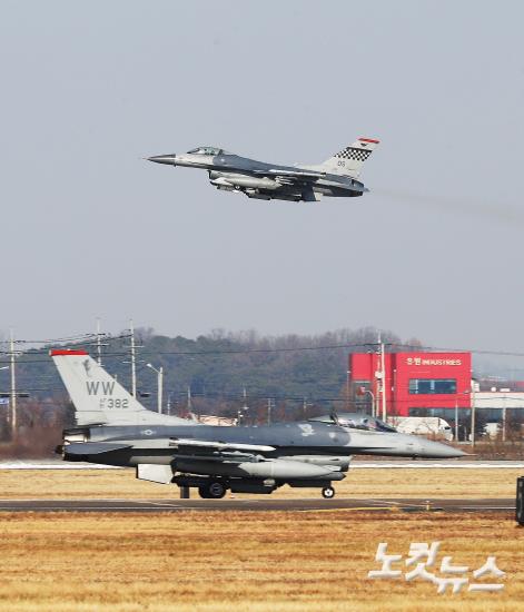 한미 양국 공군이 역대 최대 규모로 진행하는 연합공중훈련 '비질런트 에이스'(Vigilant ACE) 훈련이 계속되고 있는 6일 오후 경기도 평택시 주한미공군 오산기지에서 F-16 전투기들이 분주하게 이동하고 있다. <사진공동취재단>사진공동취재단>