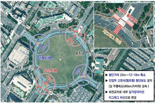창원시는 이같은 문제점을 개선하기 위해 남북측 중앙교통섬에 횡단보도를 추가로 설치해 횡단보도를 단축(기존 23m→12m~18m)하고 진입부 횡단보도는 고원식으로 변경해 진입차량의 속도를 낮추도록 할 예정이다.