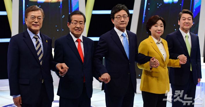더불어민주당 문재인(왼쪽부터), 자유한국당 홍준표, 바른정당 유승민, 정의당 심상정, 국민의당 안철수 대선후보가 2일 오후 서울 상암동 MBC 스튜디오에서 선거관리위원회 주최로 열린 마지막 TV토론에 앞서 포즈를 취하고 있다. (사진=국회사진취재단/자료사진)