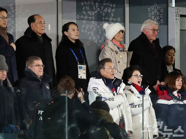 남북은 이후 시작된 개막식 행사를 함께 관람했다. 문 대통령과 김정숙 여사의 바로 뒷 줄에 김 위원장과 김 부부장이 앉았다.