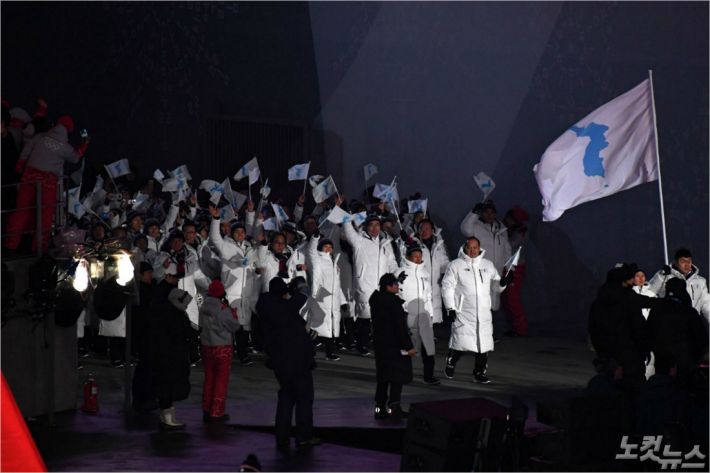 9일 오후 강원도 평창 올림픽 스타디움에서 열린 2018 평창동계올림픽 개회식에서 남북 대표팀 선수단이 한반도기를 흔들며 입장하고 있다. 이한형기자