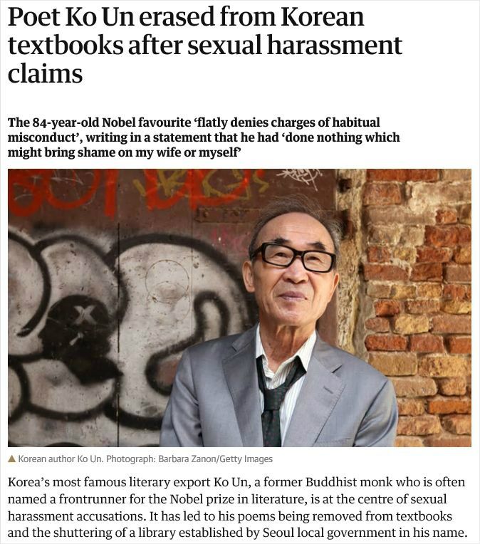 이 출판사는 "우리는 한국에서 이미 지워지고 있는 고은의 문학적 유산과 함께할 것이지만, 의혹이 제기된 잘못들을 용인하지도 않을 것"이라고 밝혔다고 가디언은 전했다.