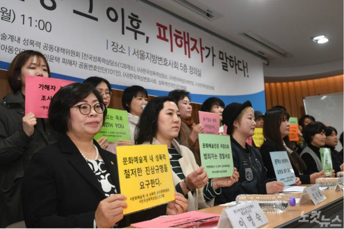 전국성폭력상담소 128곳과 한국여성단체연합, 공동변호인단 101명 등으로 구성된 '문화 예술계 내 성폭력 공동대책위원회'는 5일 서울 서초구 서울지방변호사회관에서 기자회견을 열고 이같이 밝혔다.
