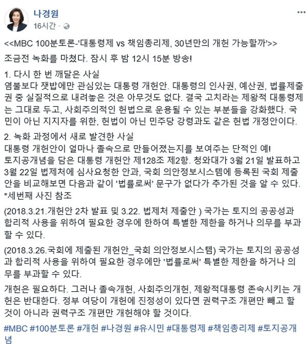 나 의원은 이날 자신의 페이스북을 통해 "청와대가 3월21일 발표하고, 22일 법제처에 심사요청한 개헌안과 국회 의안정보시스템에 등록된 국회 제출안을 비교해보면 (토지공개념 부분에서) '법률로써' 문구가 없다가 추가된 것을 알 수 있다"고 했다.