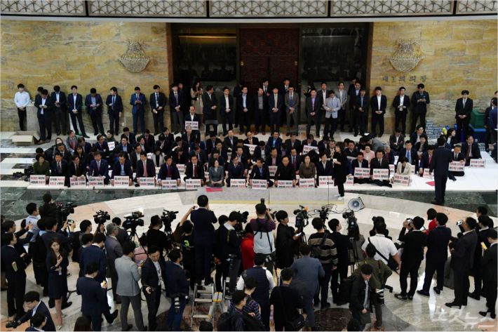 한국당 의원들은 스크럼을 짜고 본회의장 입구를 막은 채 민주당 규탄 릴레이 발언을 이어갔다.