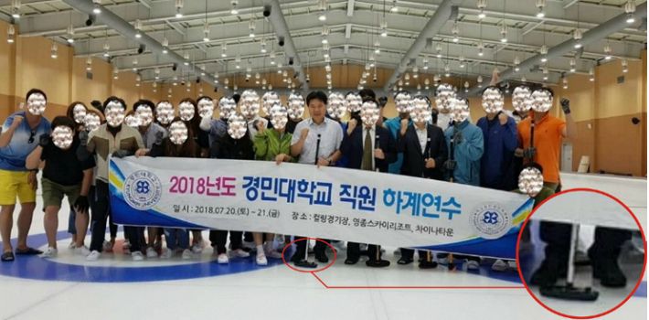 '컬링 시트'라는 직사각형 링크 안에서 촬영된 사진에는 실내화를 신고 있는 직원들과 달리 홍 의원은 구두를 신고 있었다.