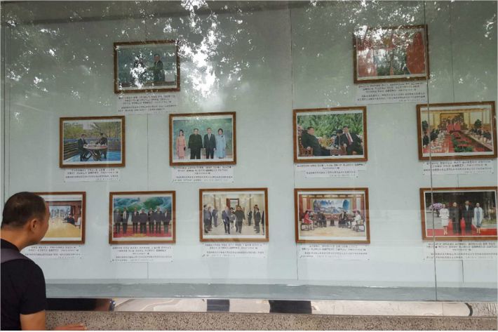 김정은 위원장과 시 주석의 지난 3월, 5월, 6월의 세 차례 정상회담 사진은 게시판의 가운데를 차지했다.