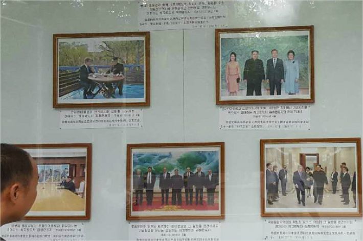 이 게시판 왼쪽의 김정은 위원장과 문재인 대통령의 사진은 지난 4월 판문점 정상회담 당시 공동 성명에 서명하는 장면과 더불어 산책하는 장면, 부부 동반 기념사진이 게재됐으며 지난 5월 북측 통일각에서 전격적으로 열렸던 남북 정상회담 장면도 걸렸다.