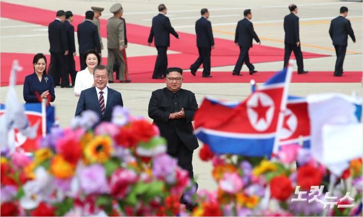 2018 남북정상회담을 위해 18일 오전 평양 순안공항에 도착한 문재인 대통령과 김정숙 여사가 공식환영식에서 김정은 국무위원장, 리설주 여사와 함께 평양시민들의 환영을 받고 있다. (평양=사진공동취재단)