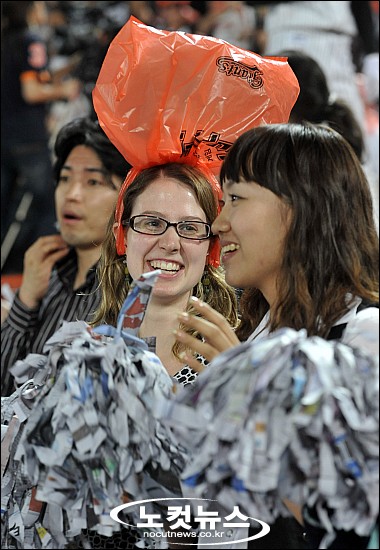 [BestNocut_R]8일 오후 부산 사직야구장에서 2008 삼성 PAVV 프로야구 준플레이오프, 롯데 자이언츠와 삼성 라이언즈의 1차전 경기가 벌어지는 가운데 한 외국인이 롯데의 상징적 응원도구인 봉투를 뒤집어 쓰고 신문지 응원을 펼치고 있다.