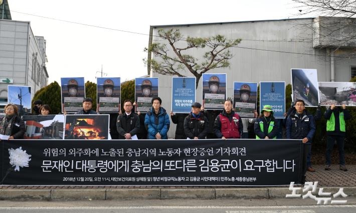 20일 오전 충남 태안보건의료원 상례원 앞에서 열린 '위험의 외주화에 노출된 충남지역 노동자 현장증언 기자회견'에서 청년 비정규직 노동자 고 김용균 시민대책이, 민주노총 세종충남본부 관계자들이 손 피켓을 들고 있다.