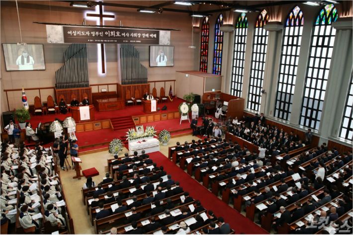 14일 오전 서울 서대문구 창천교회에서 열린 故 이희호 여사 장례예배.(사진=이한형기자)
