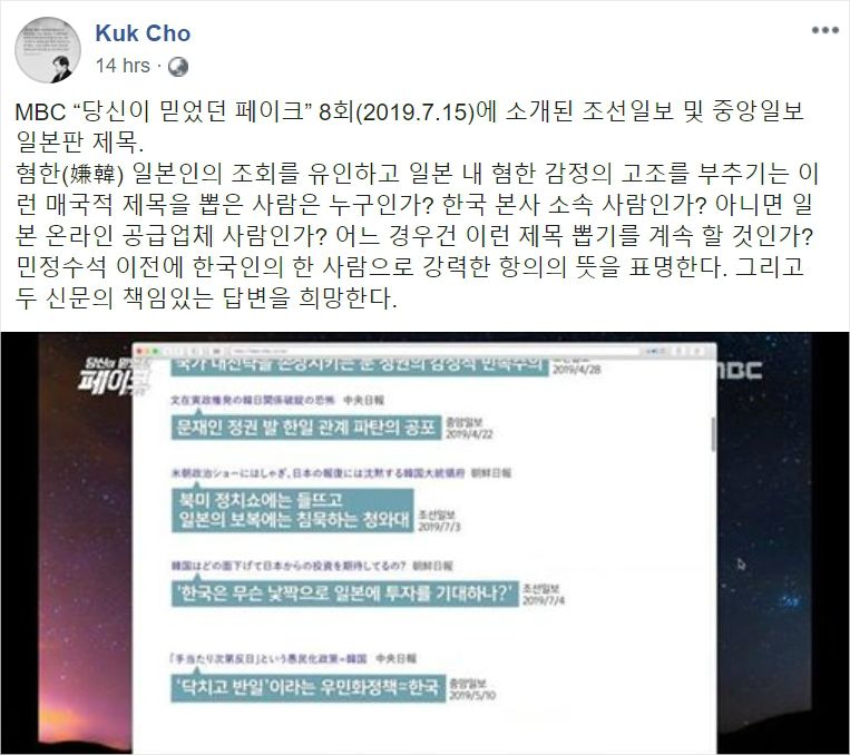 청와대 조국 민정수석이 일부 국내 언론의 일본판 기사에 대해 "혐한 일본인의 조회를 유인하고 일본 내 혐한 감정의 고조를 부추기는 이런 매국적 제목을 뽑은 누구인가?"라고 비판했다.