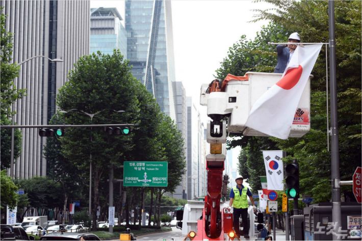 일본이 한국을 전략물자 수출심사 우대국(화이트리스트)에서 제외한 2일 오후 서울 강남구 테헤란로에서 강남구청 관계자가 강남구 일대에 게시된 만국기 중 일장기를 철거하고 있다. 황진환기자