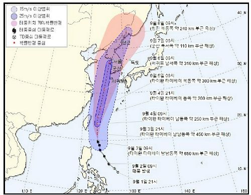타이완 타이베이 북동쪽 약 300km 부근 해상에 접근하는 5일 오전 9시에는 강풍반경이 320km로 확대되고 최대 풍속도 초속 37m로 매우 강한 바람이 예상된다.