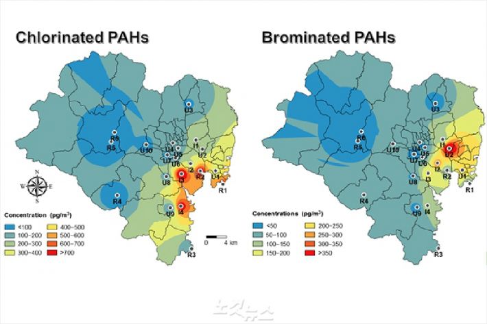 염소화 다환방향족탄화수소의 경우 석유화학, 조선, 비철 단지를 중심으로 농도가 높았고, 브롬화 다환방향족탄화수소는 석유화학, 자동차 단지 부근에서 그 비중이 높았다.