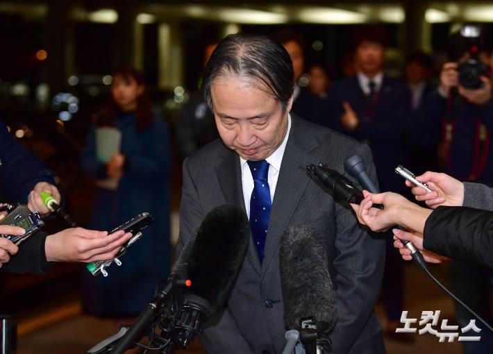 도미타 고지(富田浩司) 신임 주한 일본대사가 3일 김포국제공항을 통해 입국해 취재진을 향해 인사하고 있다.