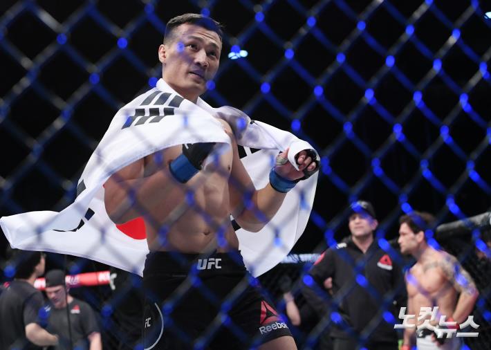 21일 오후 부산 사직실내체육관에서 열린 'UFC 파이트 나이트 부산' 메인카드 페더급 경기. 정찬성이 프랭키 에드가에게 TKO로 승리 후 환호하고 있다.