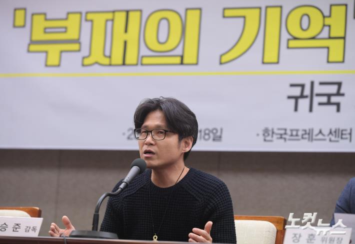 18일 오전 서울 중구 프레스센터에서 열린 영화 '부재의 기억' 그 못다한 이야기 귀국 보고 기자간담회에서 이승준 감독이 인사말을 하고 있다.