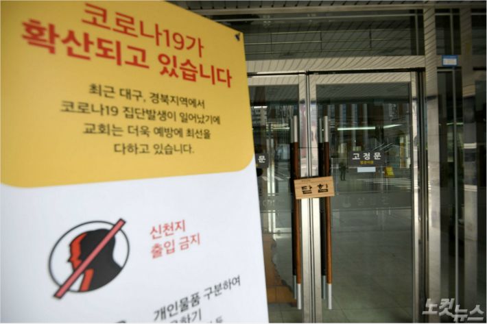 코로나19 확진자가 나온 국내 한 대형교회가 교인들의 출입을 통제하고 있다. 이한형기자