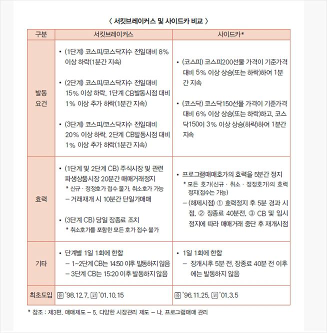 사이드카란 시장 상황이 급변할 경우 프로그램 매매 호가를 일시적으로 제한함으로써 프로그램 매매가 시장에 미치는 충격을 완화하기 위한 제도다. 유가증권시장 매도 사이드카는 선물 가격이 5% 이상 하락한 상태가 1분 이상 지속할 때 발동된다.