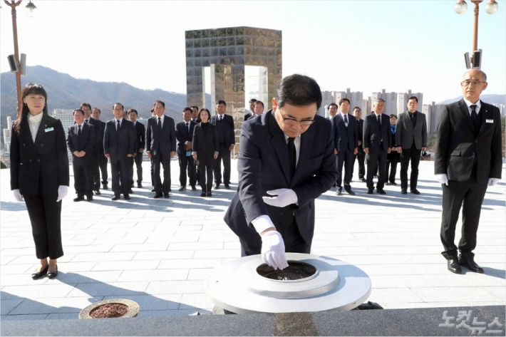 허성무 창원시장이 15일 대한민국 첫 유혈 민주화운동인 3·15의거 60주년을 맞아 3·15의거기념탑과 국립3·15민주묘지를 잇따라 방문해 참배했다. (사진=창원시 제공)