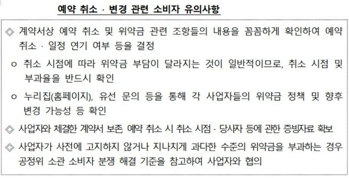 분쟁조정과정이나 법정 소송으로까지 이어질 것에 대비해 영수증 같은 증빙 자료를 챙겨두는 것이 우선 중요하다. 또 계약취소 시점에 따라 위약금 액수가 결정되는 만큼 사전에 계약 해제 의사를 명확히 해야 한다고 당부하고 있다.