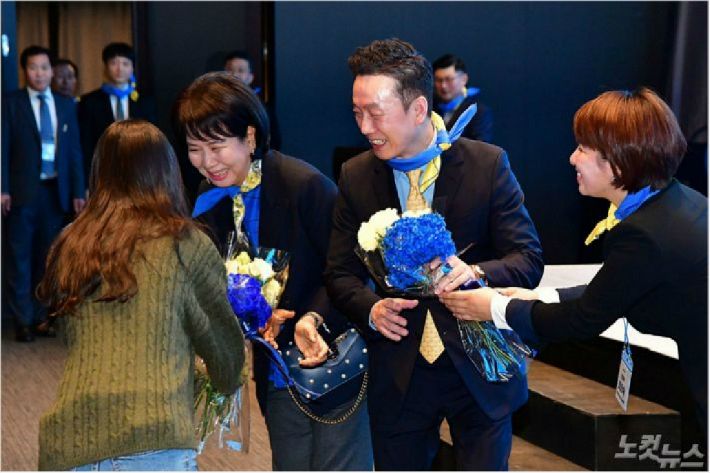8일 오후 여의도 글래드 호텔에서 열린 열린민주당 중앙당 창당대회에서 손혜원 의원과 정봉주 전 의원이 참석하며 꽃다발을 받고 있다. 윤창원기자